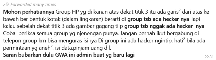 Lebih lanjut Alfons mengatakan, berbeda cerita jika ada salah satu anggota grup kena hack. Ini yang bisa berbahaya.